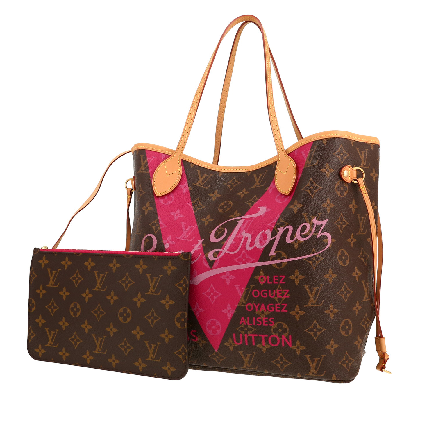 Bolso Cabás Louis Vuitton Neverfull Editions Limitées modelo mediano de lona Monogram con diseños geométricos y cuero natural, adorno en metal dorado, doble asa de cuero natural para llevar en la mano o al hombro.