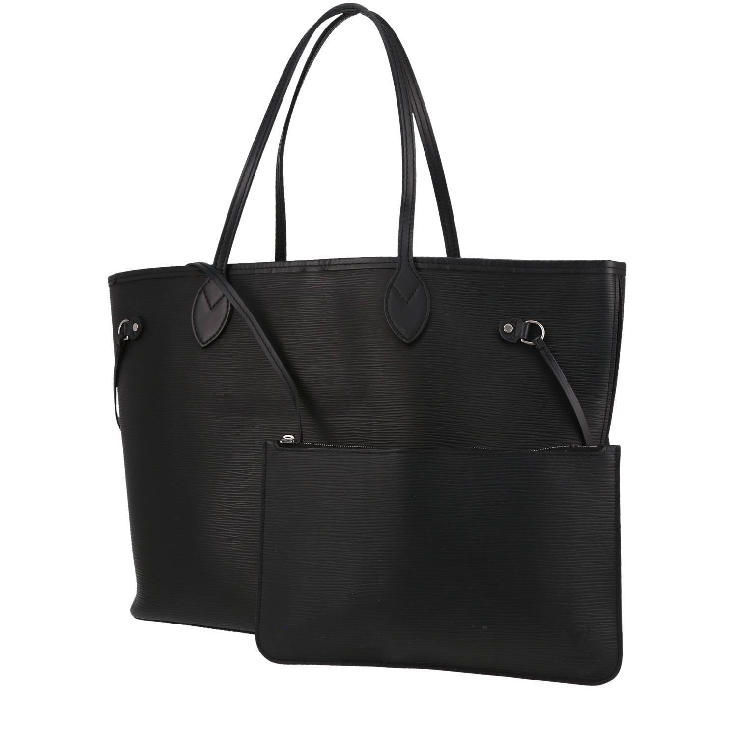 Inconfundible bolso Cabás Louis Vuitton Neverfull modelo mediano de cuero Epi negro, adorno en metal plateado, doble asa de cuero Epi negro para llevar en la mano o al hombro.