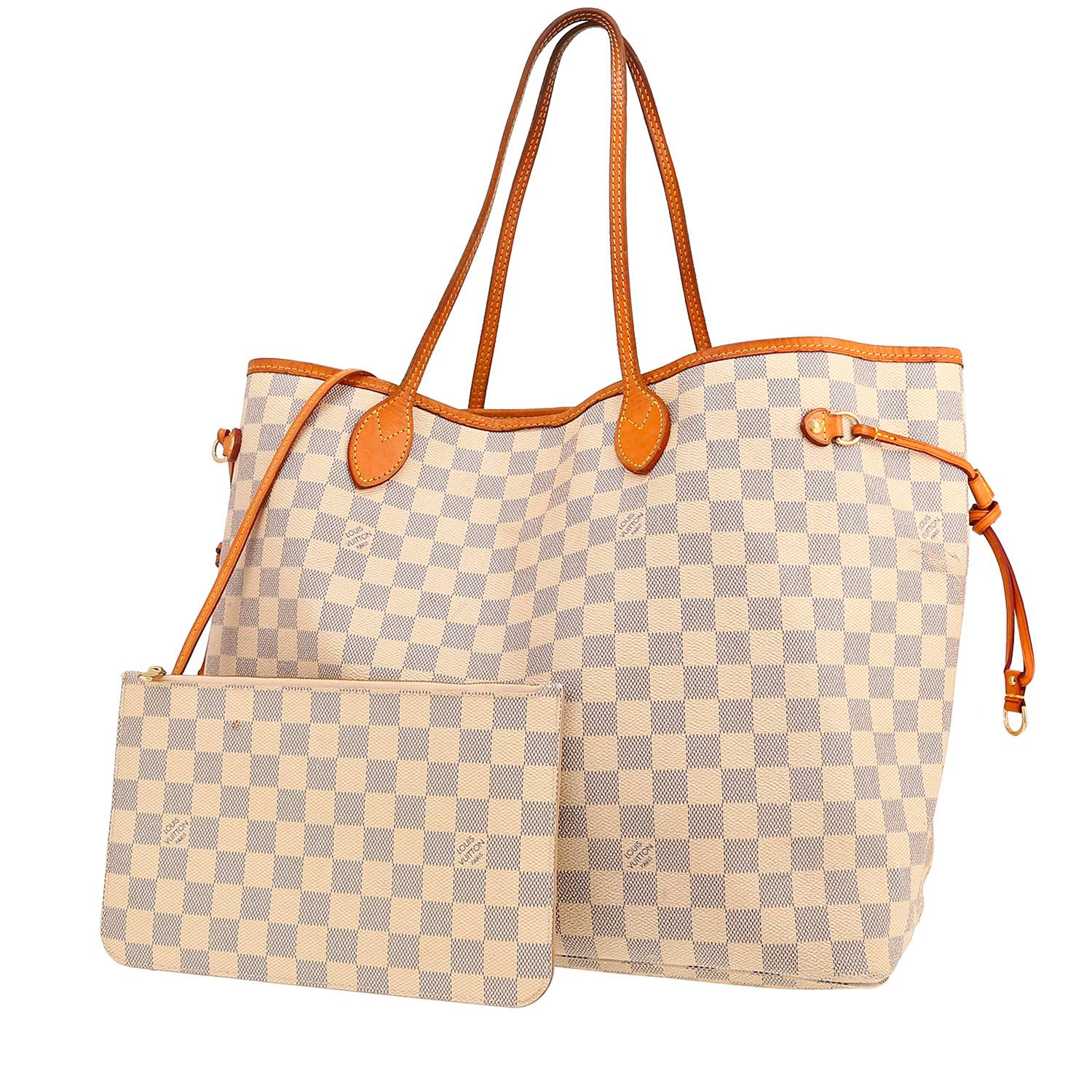 Inconfundible bolso Cabás Louis Vuitton Neverfull de lona a cuadros azul celeste y cuero natural, adorno en metal dorado, doble asa de cuero natural para llevar en la mano o al hombro.