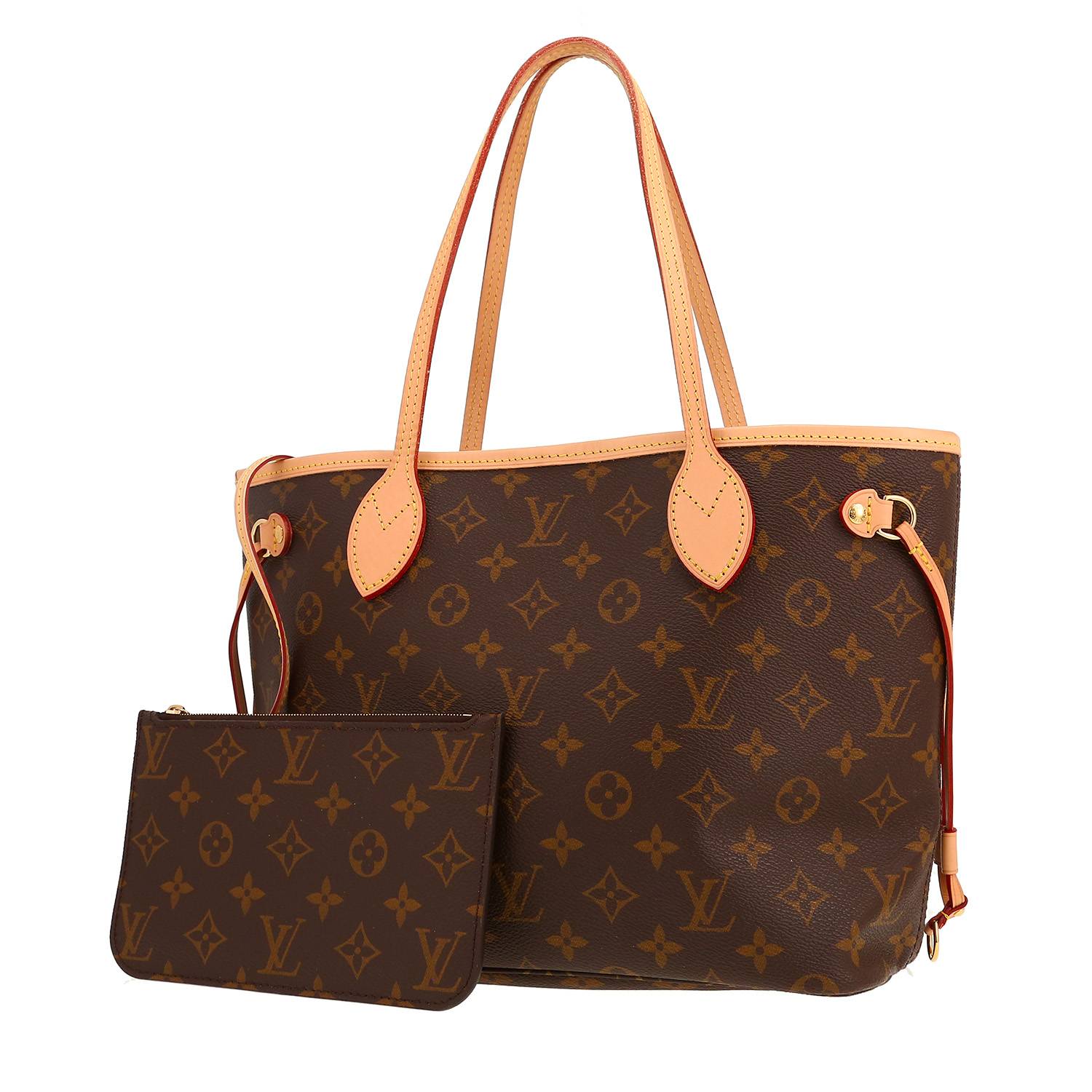 Magnífico bolso Cabás Louis Vuitton Neverfull modelo pequeño de lona Monogram marrón y cuero natural, adorno en metal dorado, doble asa de cuero natural para llevar en la mano o al hombro.