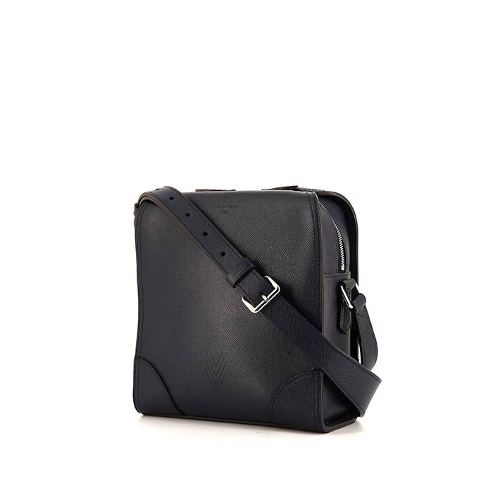 Práctico bolso bandolera Louis Vuitton Nikolai Messenger modelo pequeño de cuero taiga azul marino, adorno en metal plateado, bandolera ajustable de cuero azul para llevar al hombro o cruzado.