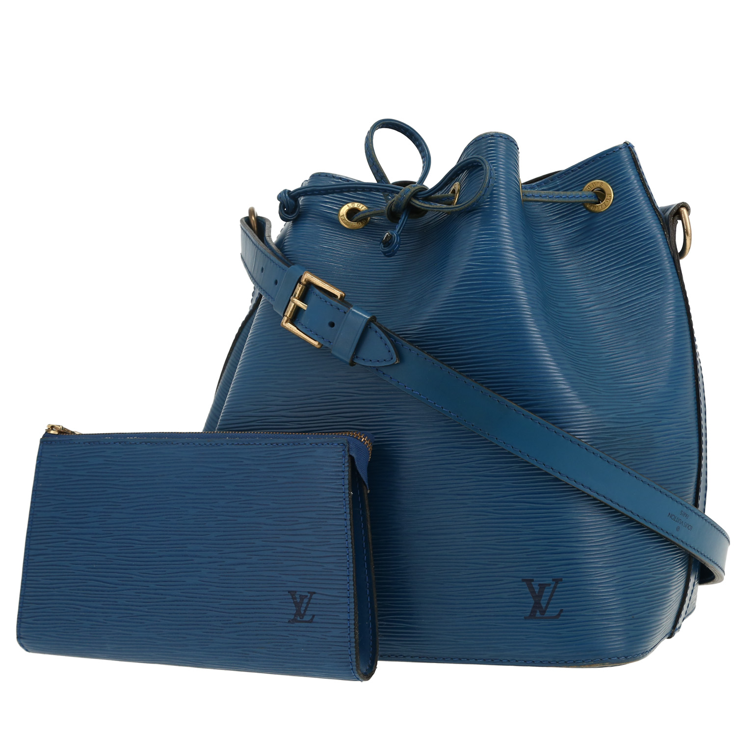 Inconfundible bolso Cabás Louis Vuitton Noé de cuero Epi azul, adorno en metal dorado, una bandolera ajustable de cuero Epi azul para llevar en la mano o al hombro.