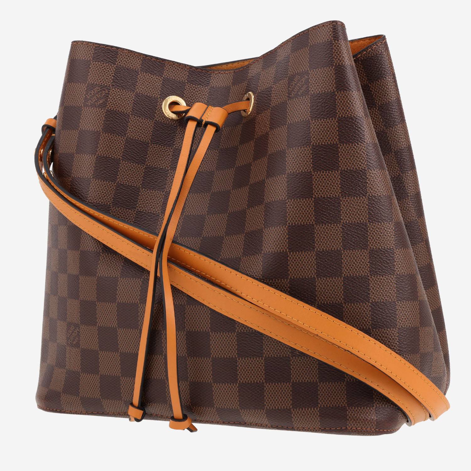 Divertido bolso de mano Louis Vuitton NéoNoé de lona a cuadros ébano y cuero azafrán, adorno en metal dorado, una bandolera ajustable de cuero azafrán para llevar al hombro o cruzado.