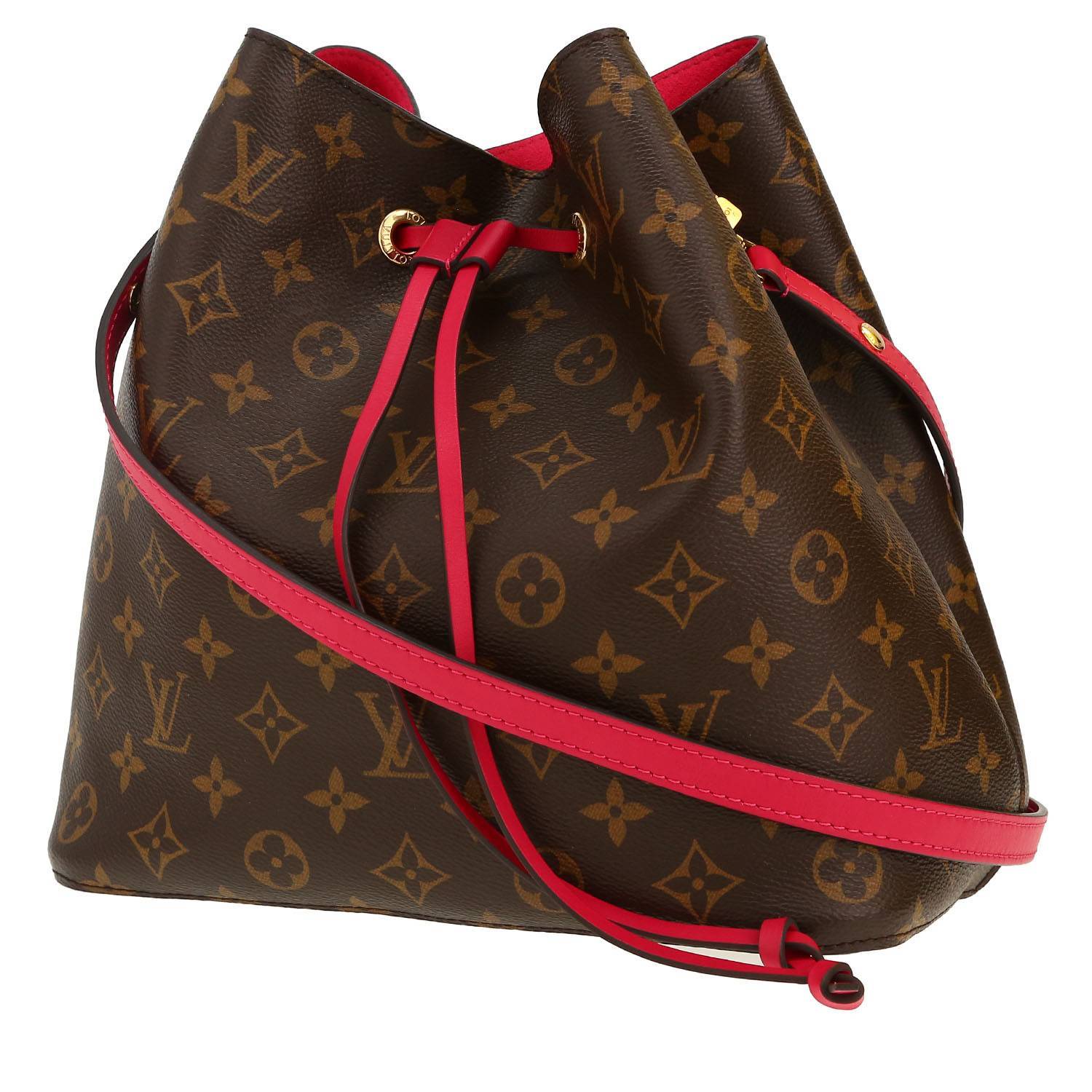 Divertido bolso bandolera Louis Vuitton NéoNoé de lona Monogram marrón y cuero rosa, adorno en metal dorado, trenzado, una bandolera extraíble de cuero rosa para llevar al hombro o cruzado.