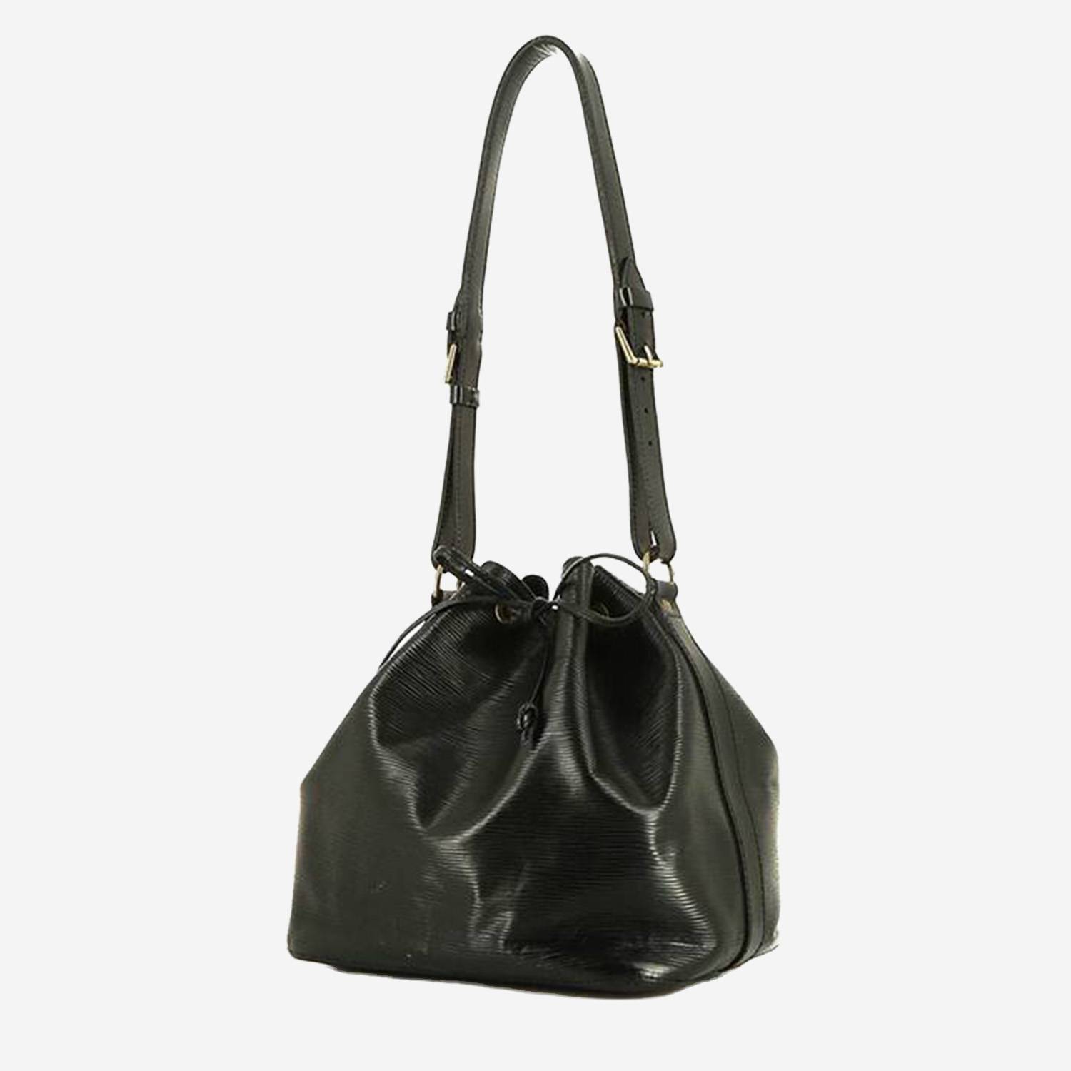Famoso bolso de mano Louis Vuitton Petit Noé de cuero Epi negro, adorno en metal dorado, asa ajustable de cuero negro.