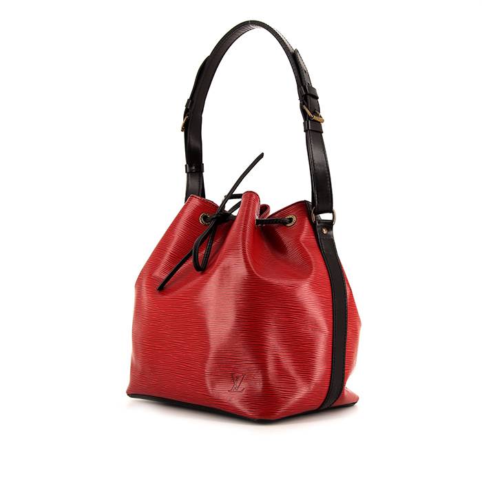 Precioso bolso de mano Louis Vuitton petit Noé modelo pequeño de cuero Epi rojo y negro, adorno en metal dorado, bandolera ajustable de cuero negro para llevar en la mano o al hombro.