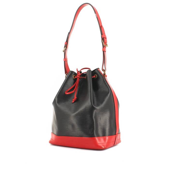 Encantador bolso zurrón "Grand Noé" modelo grande de cuero Epi negro y rojo, asa sencilla ajustable de cuero rojo para llevar en la mano o al hombro.