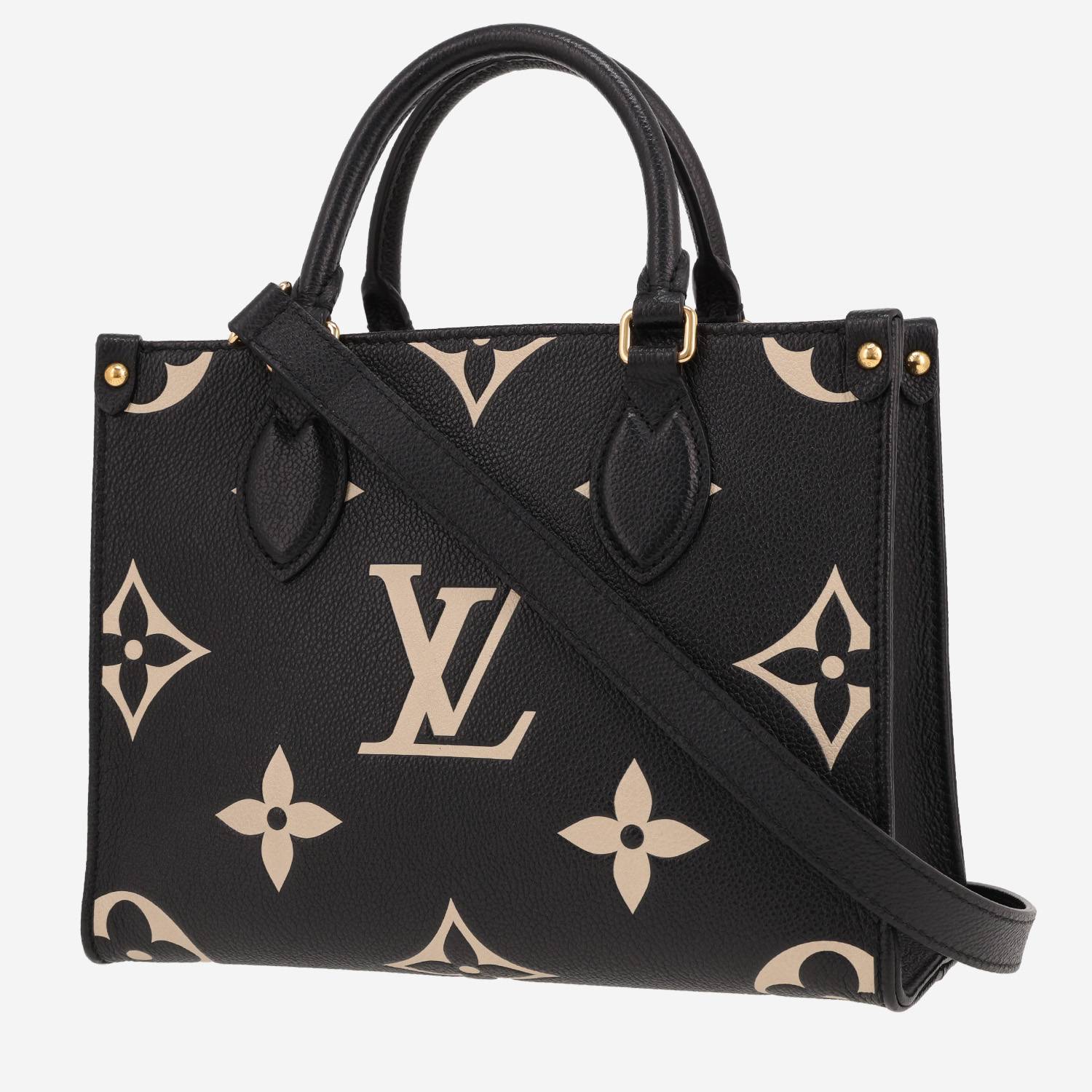 Bolso Cabás Louis Vuitton Onthego modelo pequeño de cuero monogram huella negro y beige, adorno en metal dorado, doble asa redonda de cuero negro, bandolera extraíble de cuero negro para llevar en la mano o colgado al hombro o cruzado.
