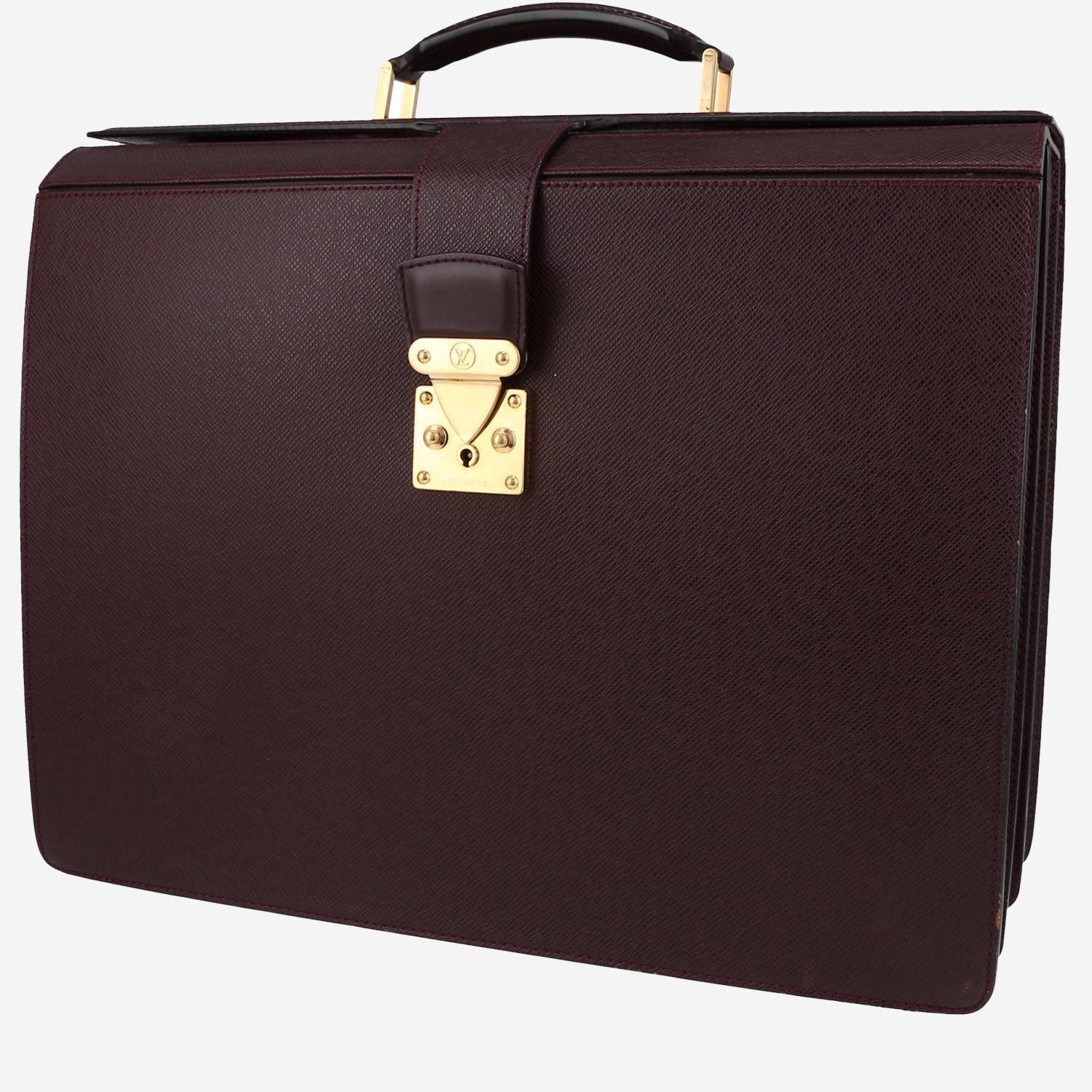 Magnífico porta-documentos Louis Vuitton Oural de cuero taiga morado, adorno en metal dorado, doble asa de cuero morado para llevar en la mano.