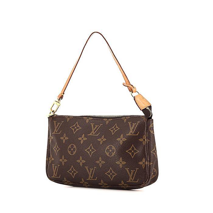 Encantador bolsito de mano Louis Vuitton de lona Monogram revestida y de cuero natural, adorno en metal dorado, asa extraíble de cuero natural para llevar en la mano o en la muñeca.