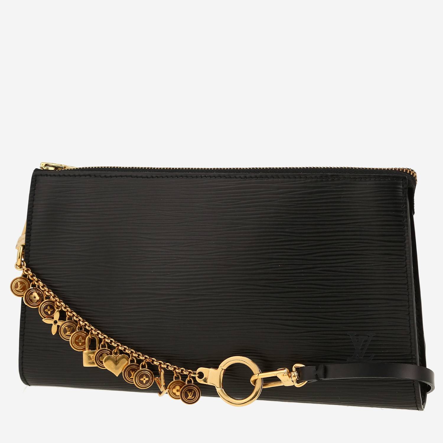 Magnífico bolsito de mano Louis Vuitton Pochette accessoires de cuero Epi negro, adorno en metal dorado, una asa extraíble de cuero negro para llevar en la mano o al hombro.