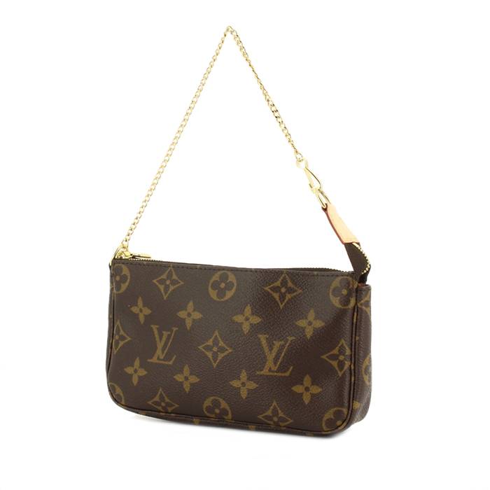 Encantador bolsito de mano "Pochette accessoires" modelo pequeño de lona Monogram y de cuero natural, adorno en metal dorado, asa de metal dorado para llevar en la mano o en la muñeca.