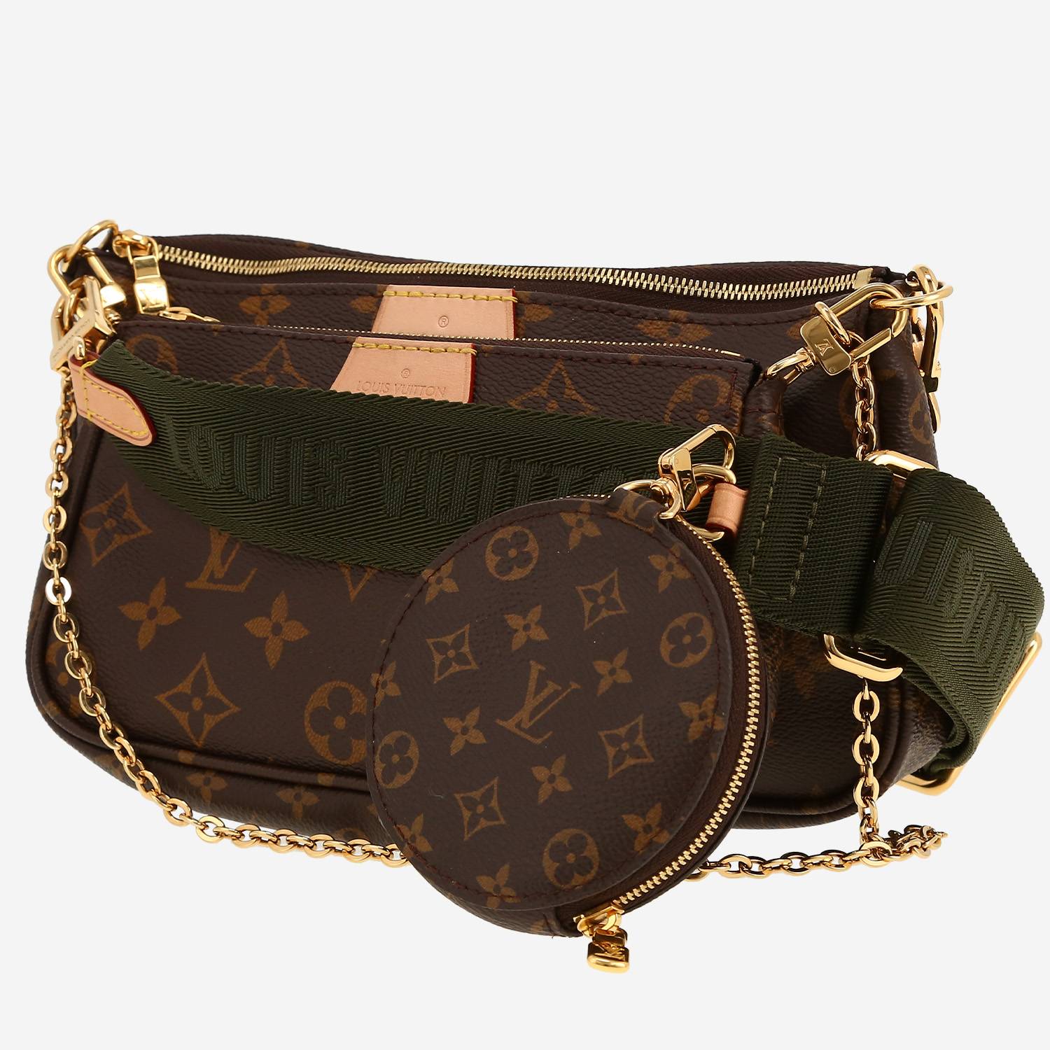 Bolso/bolsito Louis Vuitton Multi-Pochette Accessoires de lona Monogram marrón y cuero natural, adorno en metal dorado, una asa en cadena de metal dorado, bandolera extraíble de lona caqui para llevar en la mano o colgado al hombro o cruzado.