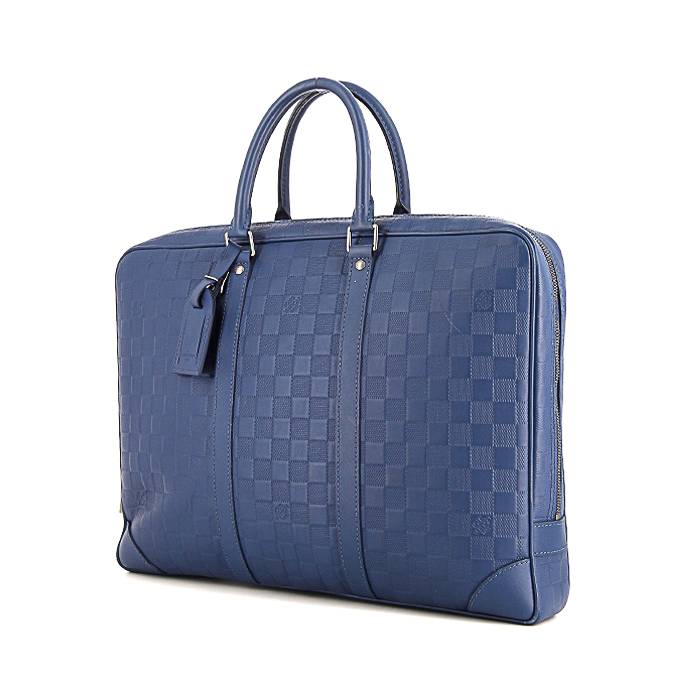 Magnífico porta-documentos Louis Vuitton de cuero azul a cuadros, adorno en metal plateado, doble asa de cuero azul para llevar en la mano.