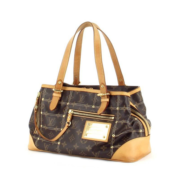 Precioso bolso de mano de lona Monogram de tachuelas y de cuero natural, adorno en metal dorado, doble asa de cuero natural para llevar en la mano o al hombro.