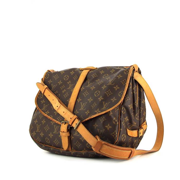 Inconfundible zurrón Louis Vuitton Saumur de lona Monogram revestida marrón y de cuero natural, adorno en metal dorado, sobrecosturas amarillas, bandolera ajustable de cuero natural para llevar al hombro o cruzado.