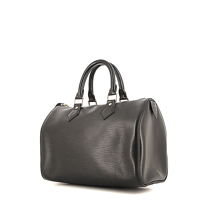 Famoso bolso de mano Louis Vuitton Speedy 25 cm de cuero Epi negro, adorno en metal dorado, doble asa de cuero negro para llevar en la mano.