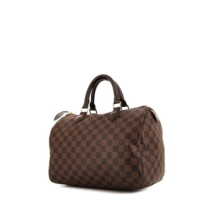 Clásico bolso de mano Louis Vuitton Speedy 30 de lona a cuadros ébano y de cuero marrón, adorno en metal dorado, doble asa de cuero marrón para llevar en la mano.