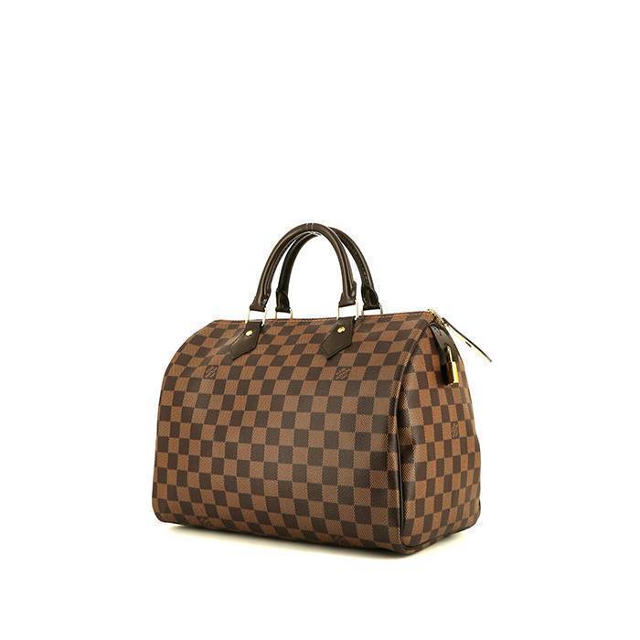 Encantador bolso de mano Louis Vuitton Speedy 30 de lona a cuadros ébano y cuero marrón, adorno en metal dorado, doble asa de cuero marrón para llevar en la mano.