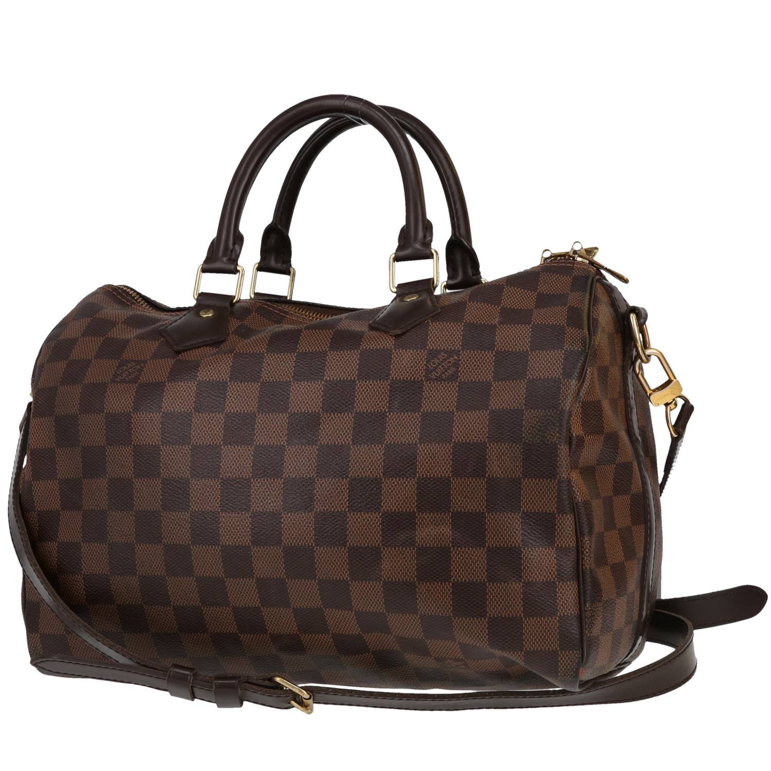 Inconfundible bolso de mano Louis Vuitton Speedy 30 de lona a cuadros ébano y cuero marrón, adorno en metal dorado, doble asa de cuero marrón, bandolera extraíble de cuero marrón para llevar en la mano o colgado al hombro o cruzado.
