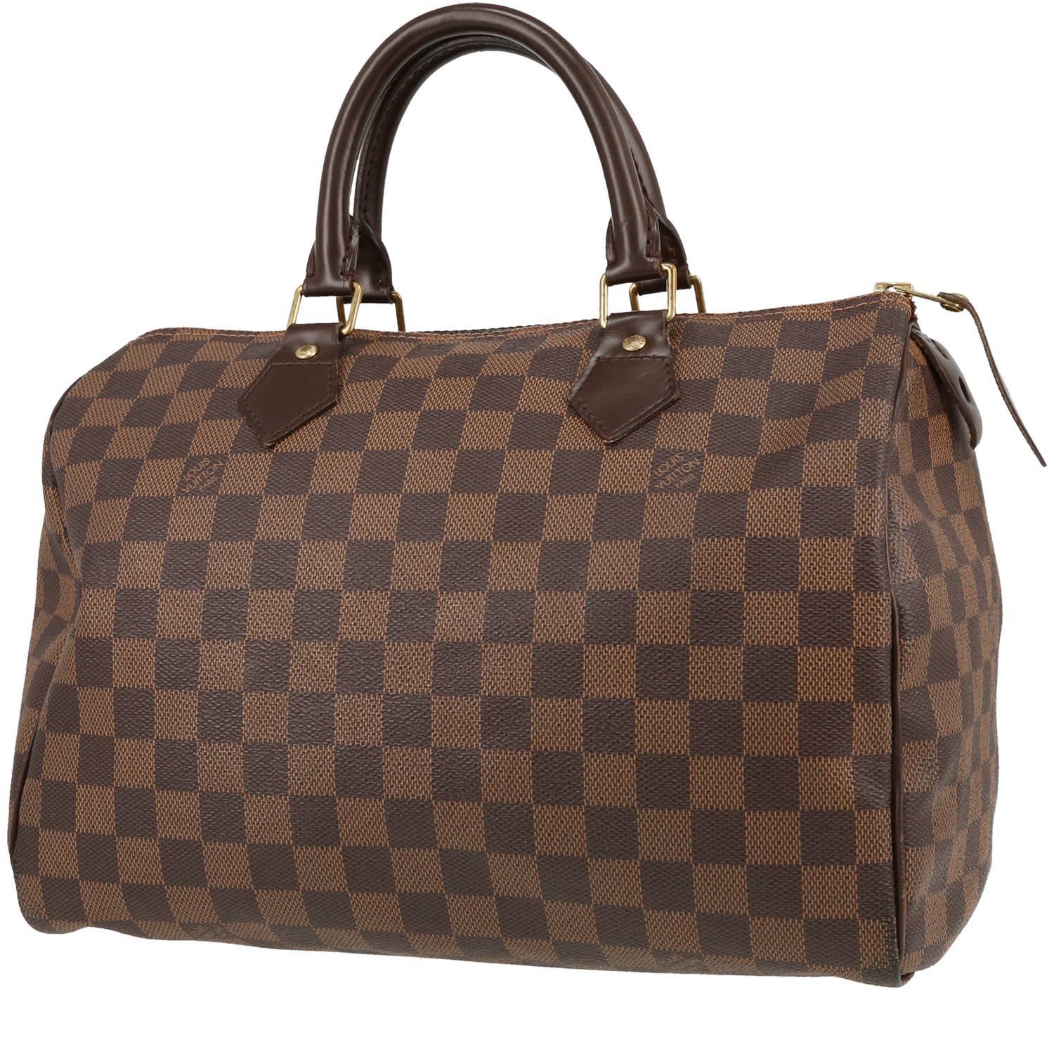 Famoso bolso de mano Louis Vuitton Speedy 30 de lona a cuadros ébano y cuero marrón, adorno en metal dorado, doble asa de cuero marrón para llevar en la mano.