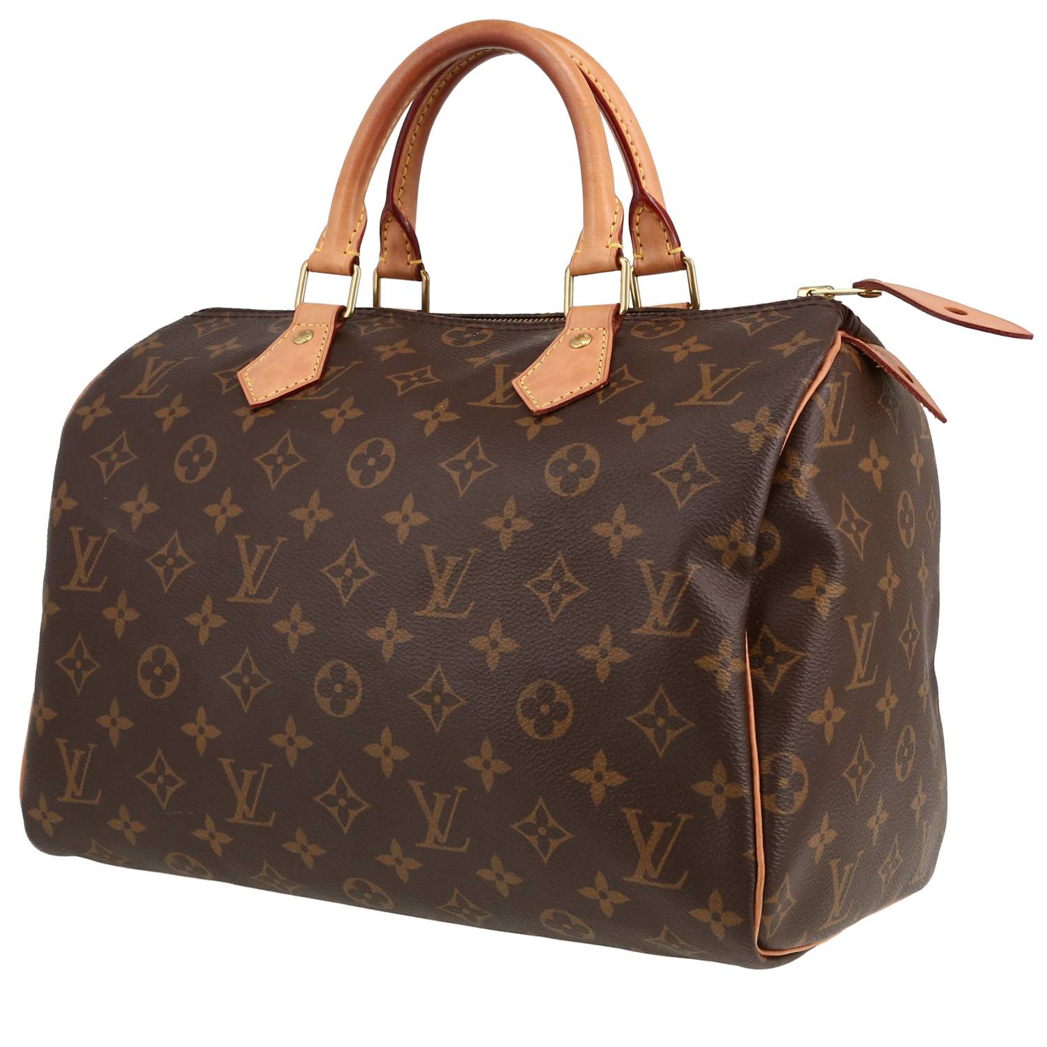 Encantador bolso de mano Louis Vuitton Speedy 30 de lona Monogram marrón y cuero natural, adorno en metal dorado, doble asa de cuero natural para llevar en la mano.