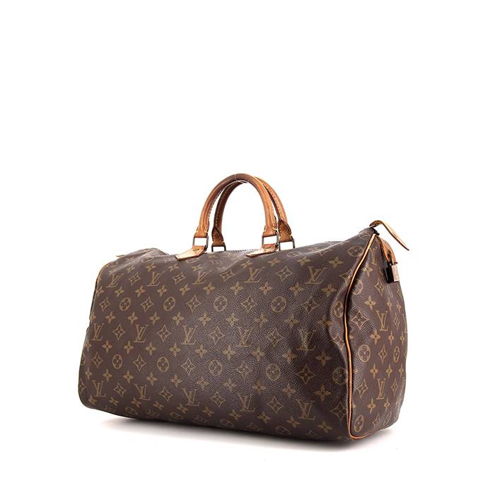 Famoso bolso de mano Louis Vuitton Speedy 40 de lona Monogram marrón y de cuero natural, adorno en metal dorado, doble asa de cuero natural para llevar en la mano.