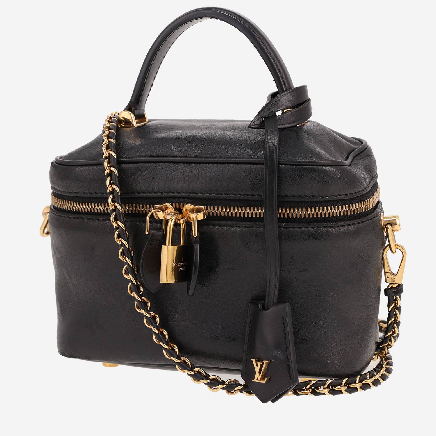 Excepcional vanity Louis Vuitton Vanity modelo pequeño de cuero negro, adorno en metal dorado, asa sencilla de cuero negro, una bandolera extraíble de metal dorado entrelazada de cuero negro para llevar en la mano o colgado al hombro o cruzado.