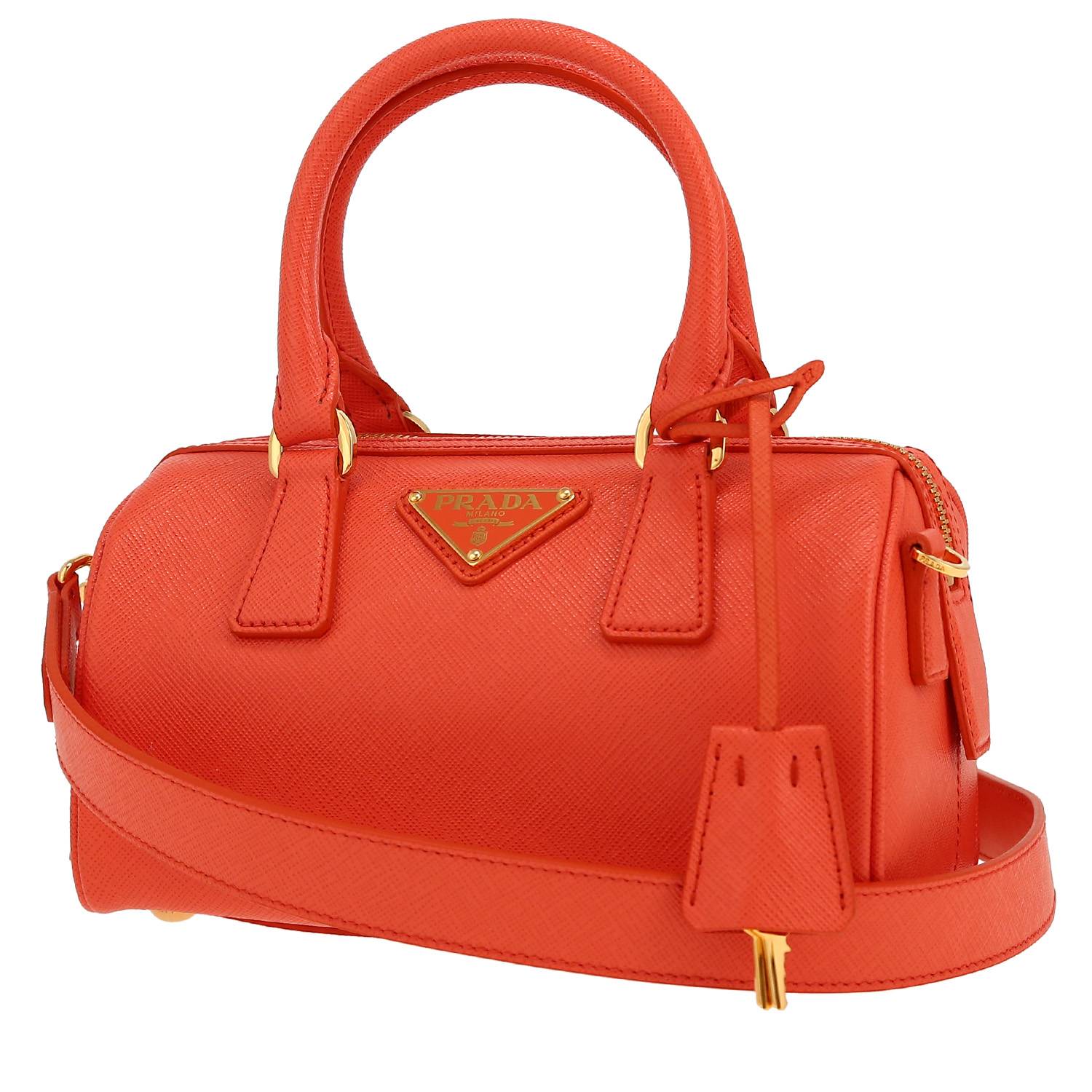 Divertido bolso de mano Prada Bauletto modelo pequeño de cuero saffiano naranja, adorno en metal dorado, doble asa de cuero naranja, bandolera extraíble de cuero naranja para llevar en la mano o colgado al hombro o cruzado.