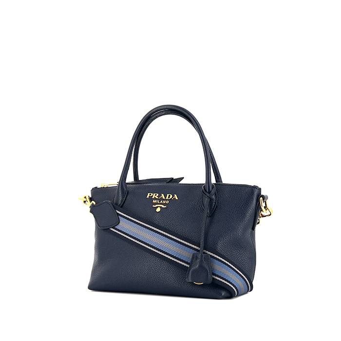 Encantador bolso bandolera Prada de cuero granulado azul, adorno en metal dorado, doble asa de cuero azul, una bandolera extraíble de lona azul con rayas, bandolera extraíble de cuero azul para llevar en la mano o colgado al hombro o cruzado.