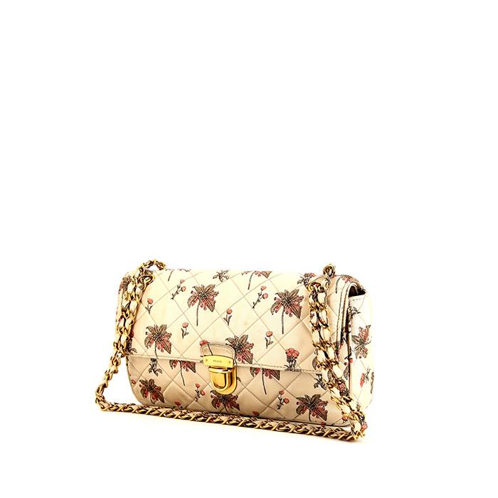 Original bolso de mano Prada de lona beige de diseño floral, adorno en metal dorado, una asa en cadena de metal dorado entrelazada de lona beige para llevar al hombro.