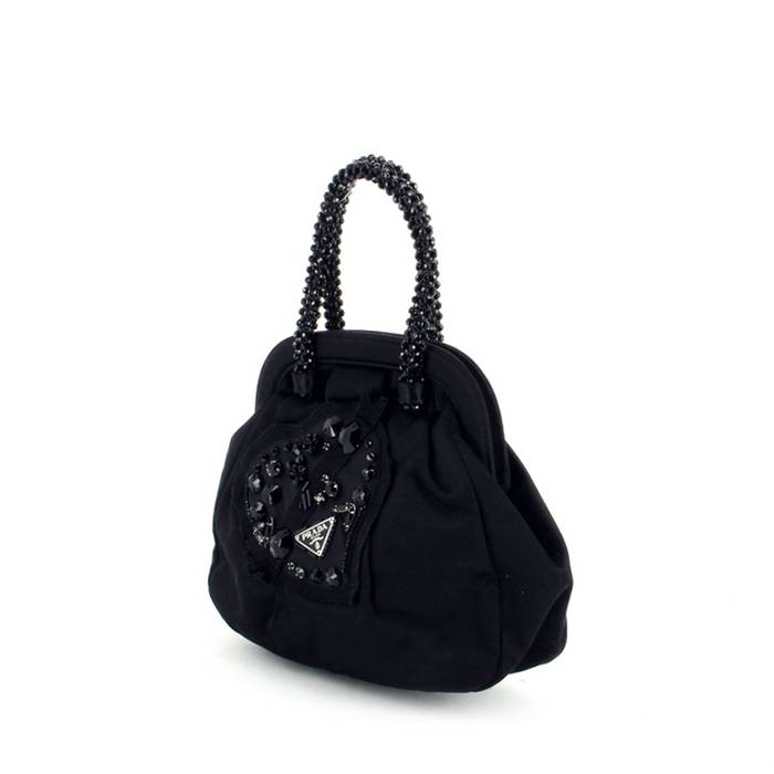 Bonito bolso de noche pequeño de satén negro bordado con perlas, doble asa adornado con perlas negras para llevar en la mano.
