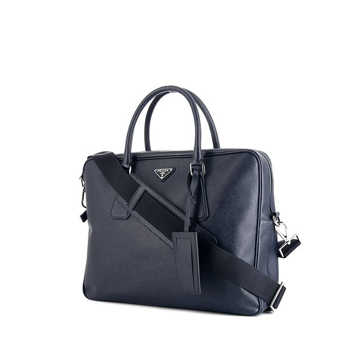 Elegante porta-documentos de cuero azul oscuro, adorno en metal plateado, doble asa de cuero saffiano, bandolera extraíble y ajustable de tela azul para llevar en la mano o colgado al hombro o cruzado.