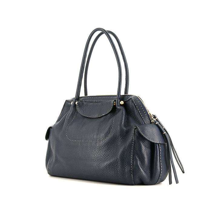 Bolso para llevar al hombro o en la mano Renaud Pellegrino de cuero azul, adorno en metal dorado, sobrecosturas color crema, doble asa de cuero azul para llevar en la mano o al hombro.