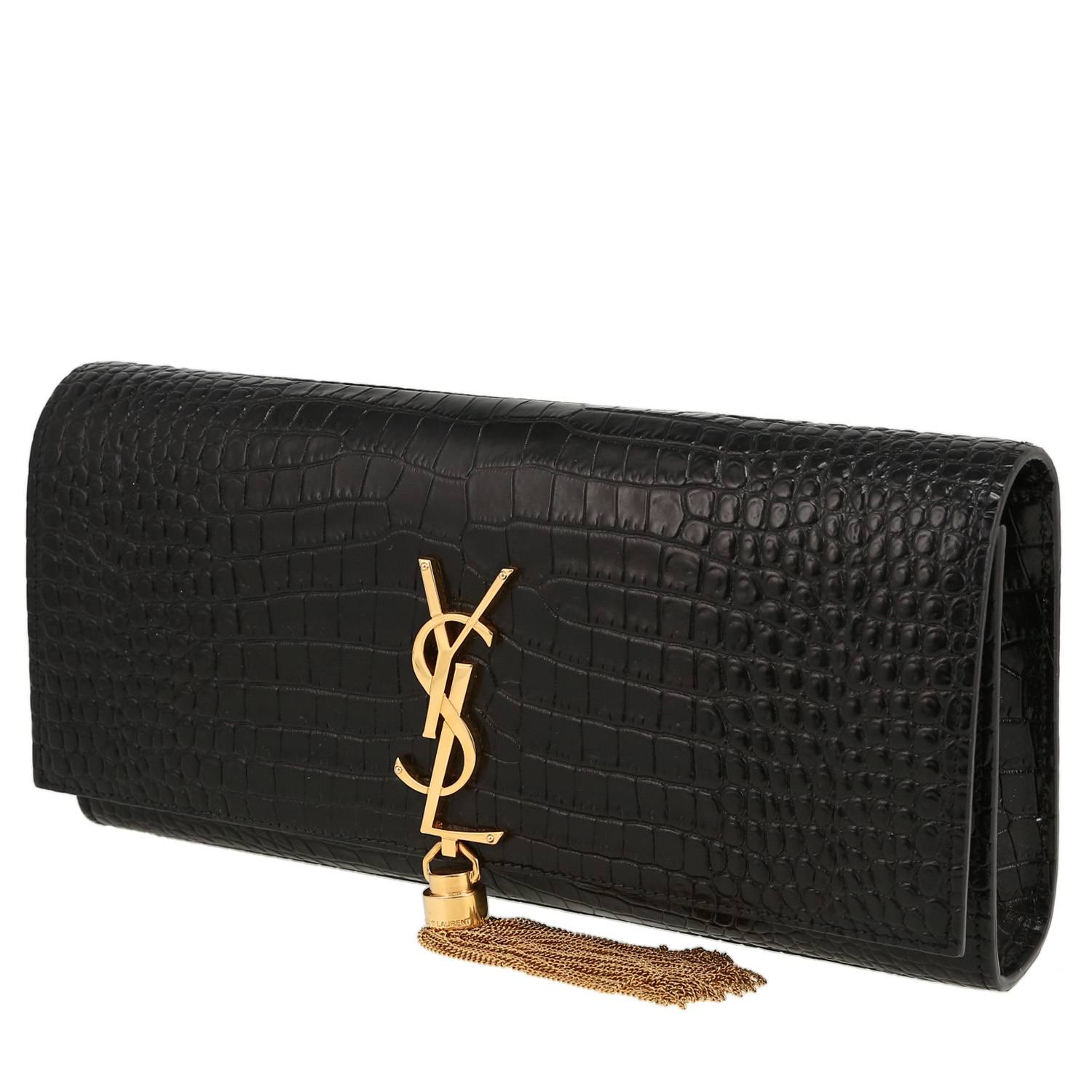 Magnífico bolsito de mano Saint Laurent Kate Pompon de cuero negro imitación piel de cocodrilo, adorno en metal dorado.