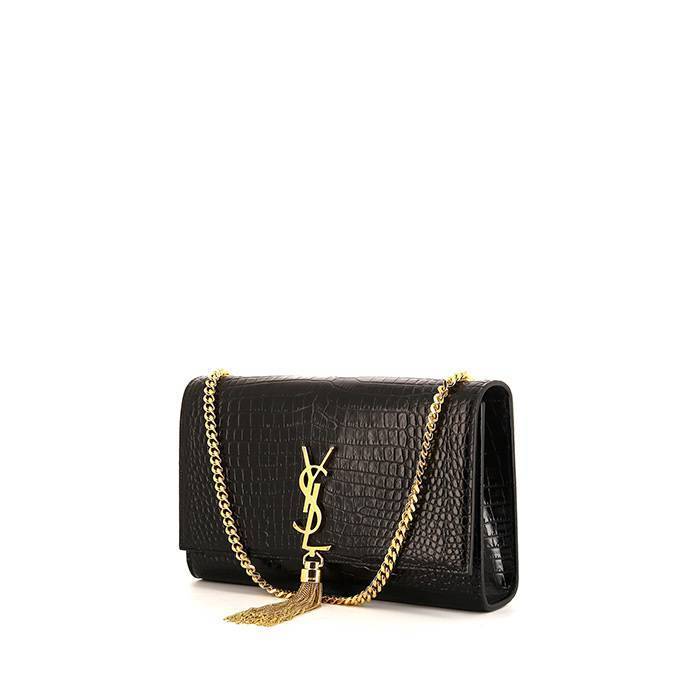 Elegante bolso Saint Laurent de cuero negro imitación piel de cocodrilo, adorno en metal dorado, una asa en cadena de metal dorado para llevar al hombro o cruzado.