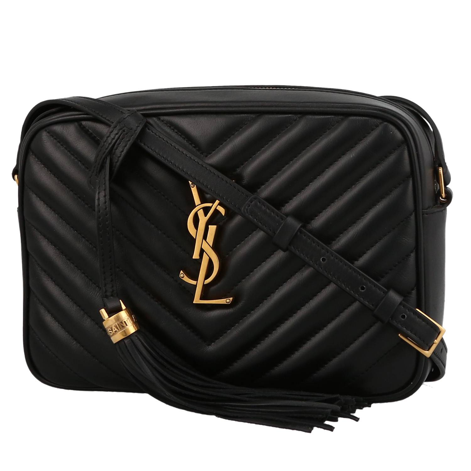 Inconfundible bolso bandolera Saint Laurent Lou Sac Caméra de cuero acolchado negro con motivos de espigas, adorno en metal dorado, bandolera de cuero negro para llevar al hombro o cruzado.
