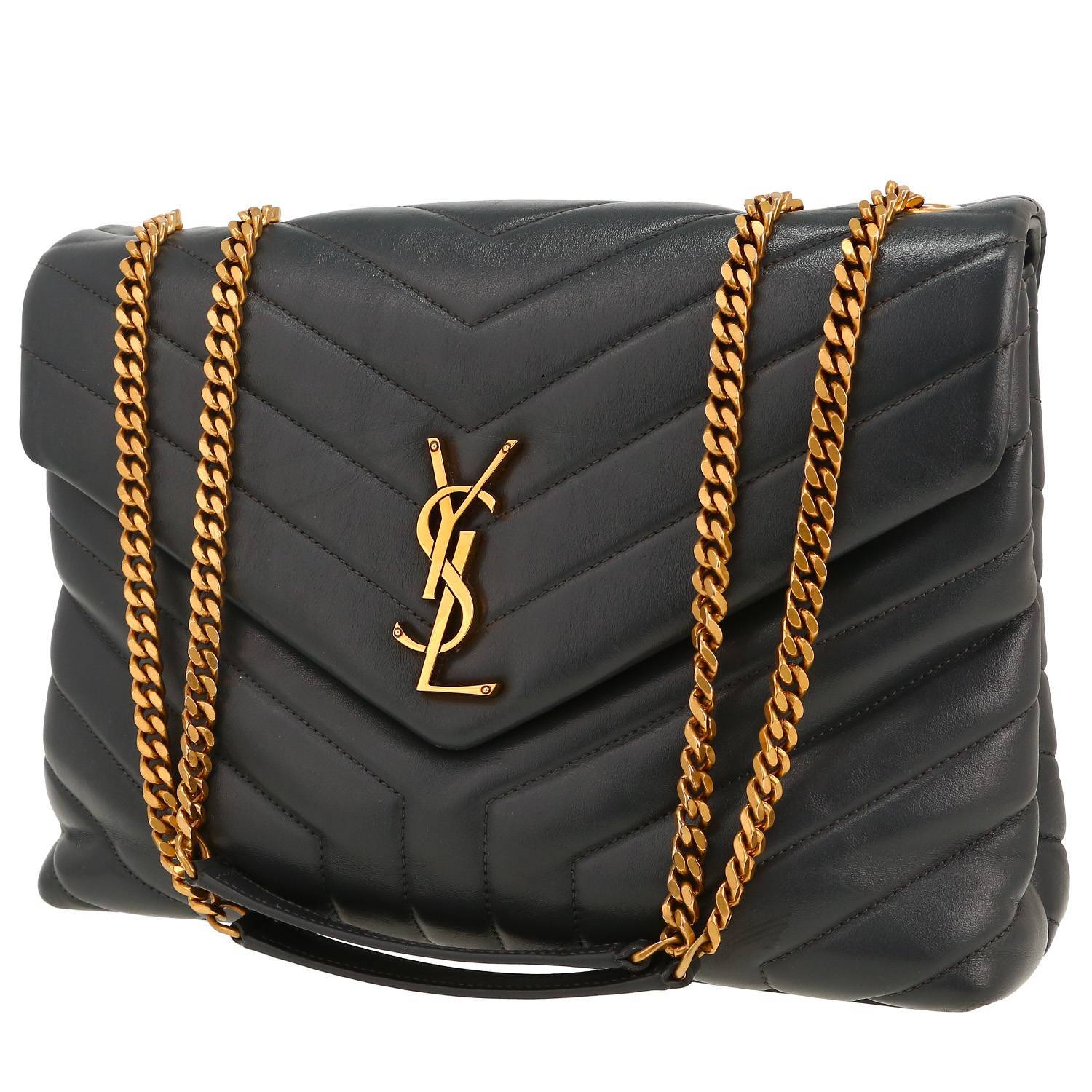 Magnífico bolso bandolera Saint Laurent Loulou modelo grande de cuero acolchado con motivos de espigas gris, adorno en metal dorado, una asa en cadena ajustable de metal dorado para llevar al hombro o cruzado.