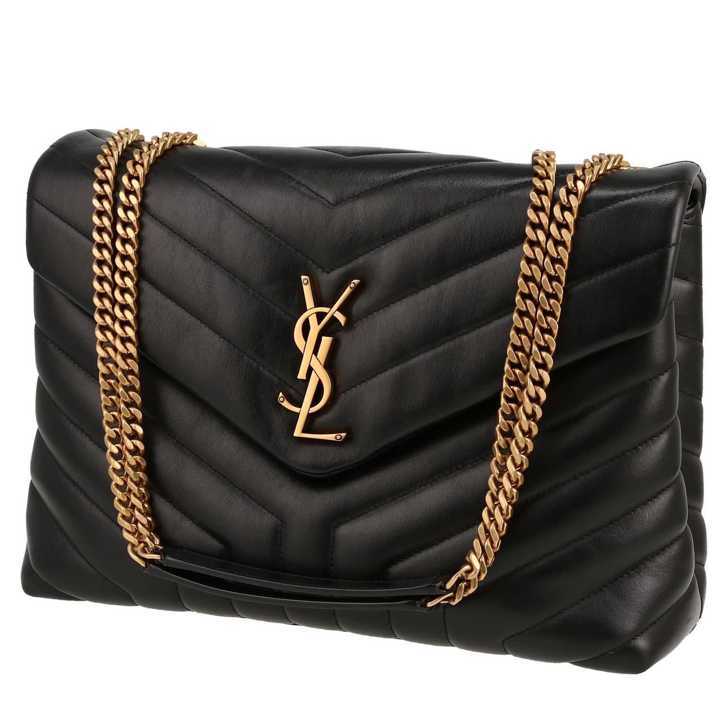 Magnífico bolso bandolera Saint Laurent Loulou modelo mediano de cuero acolchado con motivos de espigas negro, adorno en metal dorado, una asa en cadena ajustable de metal dorado para llevar al hombro o cruzado.