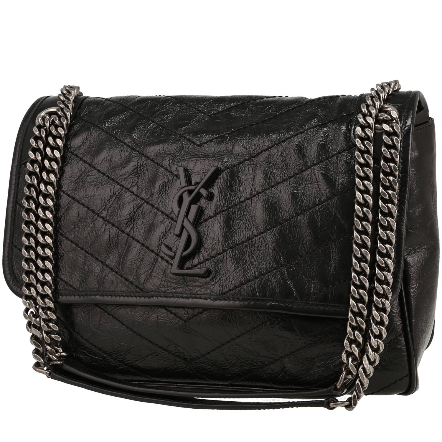 Inconfundible bolso bandolera Saint Laurent Niki modelo mediano de cuero negro con motivos de espigas, adorno en metal plateado negro, doble asa en cadena ajustable de metal plateado negro para llevar al hombro o cruzado.