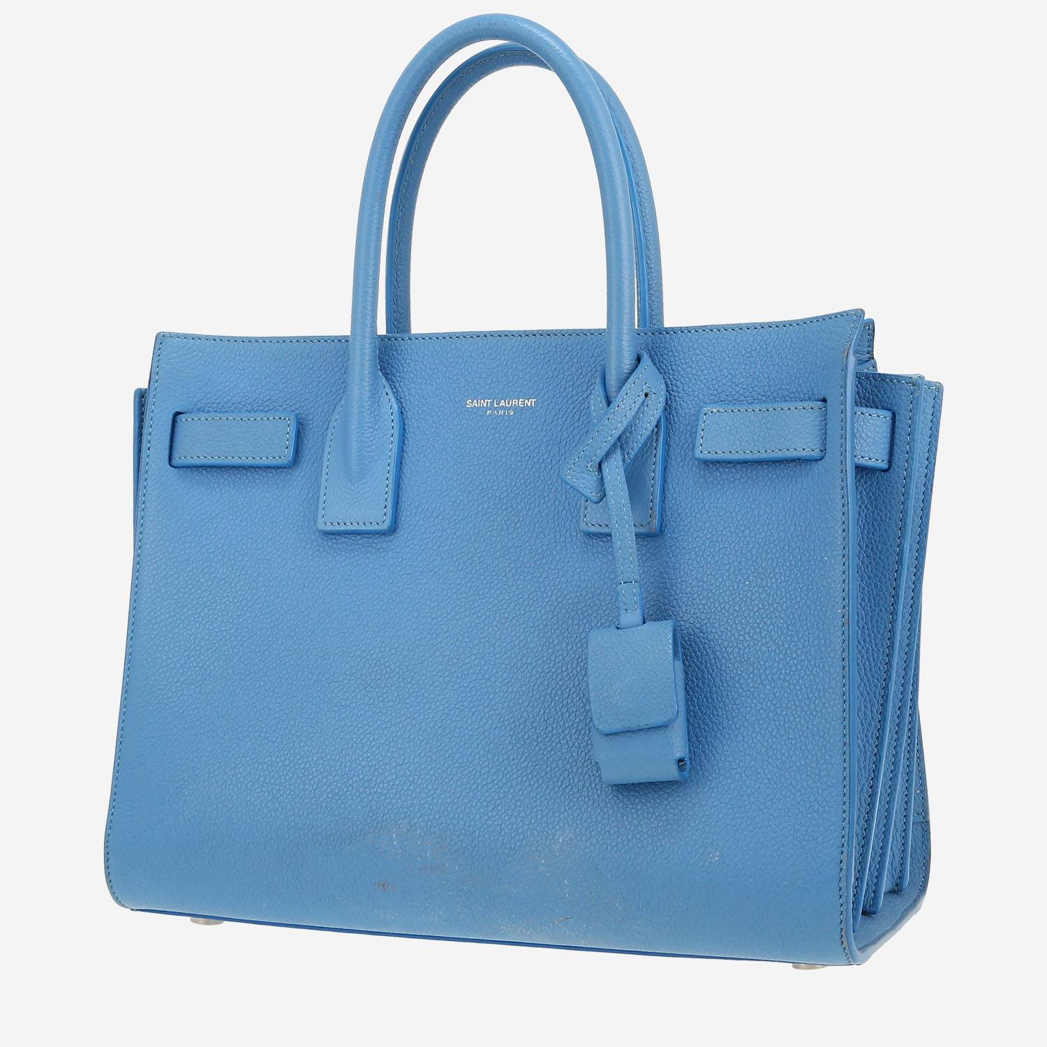 Inconfundible bolso de mano Saint Laurent Sac de jour Baby de cuero azul, adorno en metal plateado, doble asa de cuero azul para llevar en la mano.