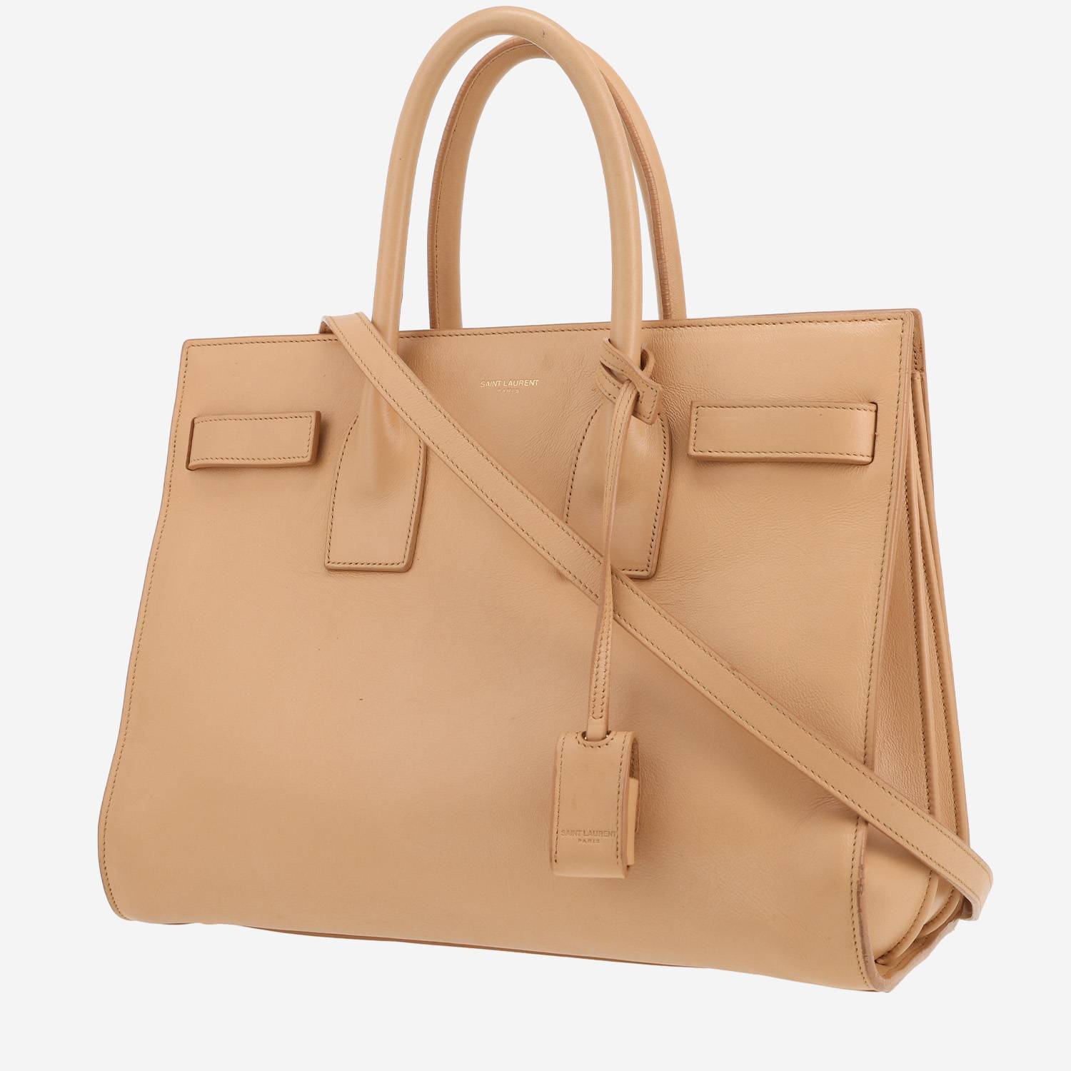 Inconfundible bolso de mano Saint Laurent Sac de jour de cuero beige, adorno en metal dorado, doble asa de cuero beige, una asa sencilla extraíble de cuero beige para llevar en la mano o al hombro.