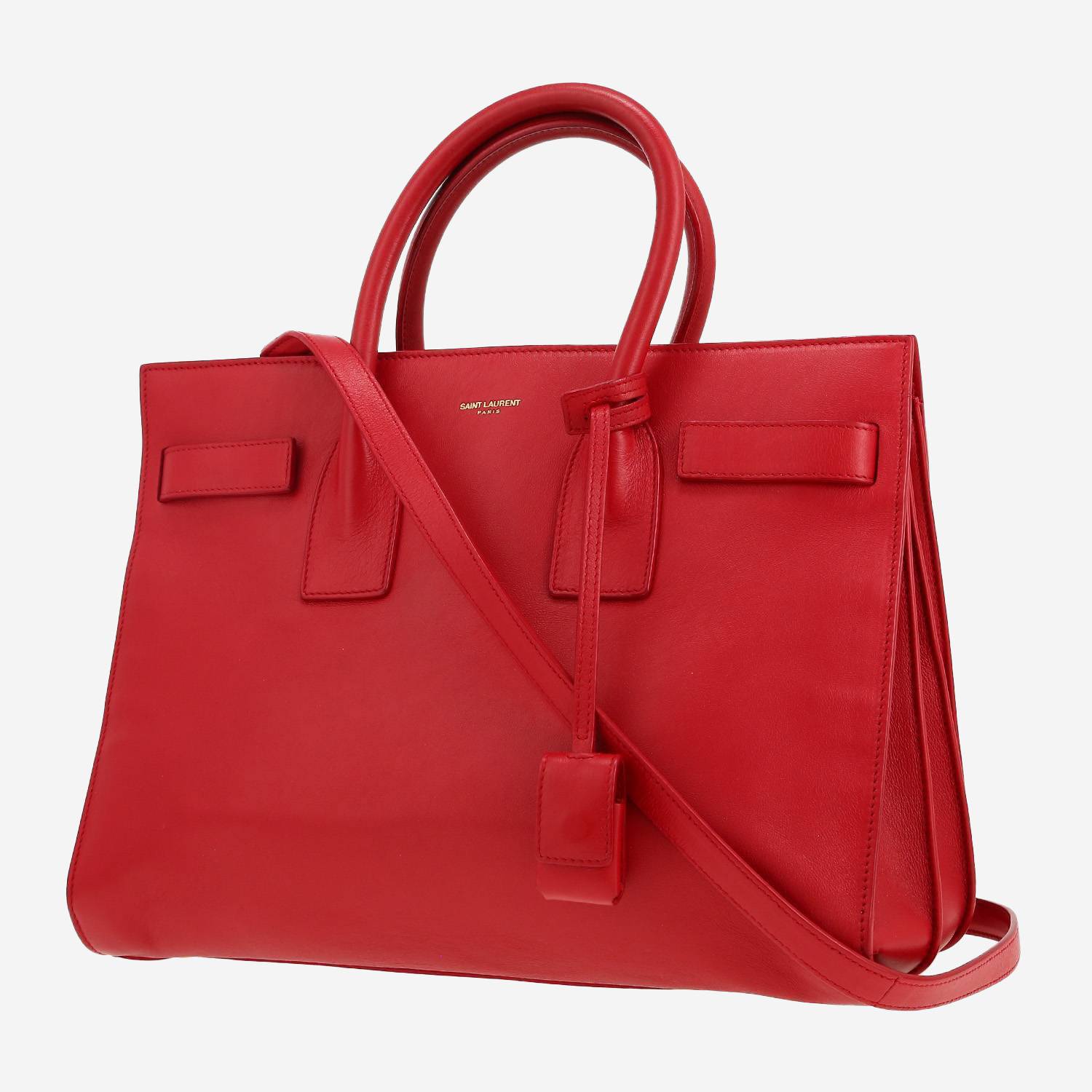 Magnífico bolso de mano Saint Laurent Sac de jour modelo pequeño de cuero rojo, adorno en metal dorado, doble asa de cuero rojo, una bandolera de cuero rojo para llevar en la mano o colgado al hombro o cruzado.