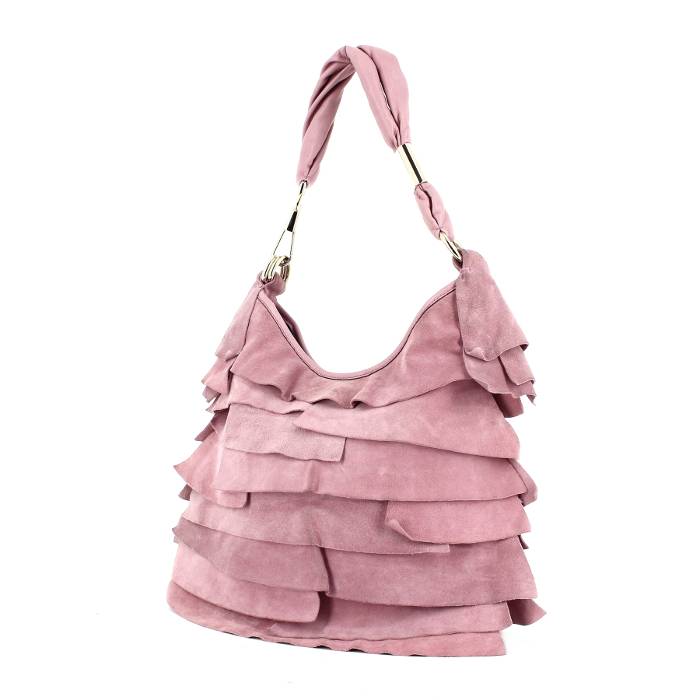 Bonito bolso de mano "Saint-Tropez" de ante rosa, una asa de cuero rosa para llevar en la mano o al hombro.
