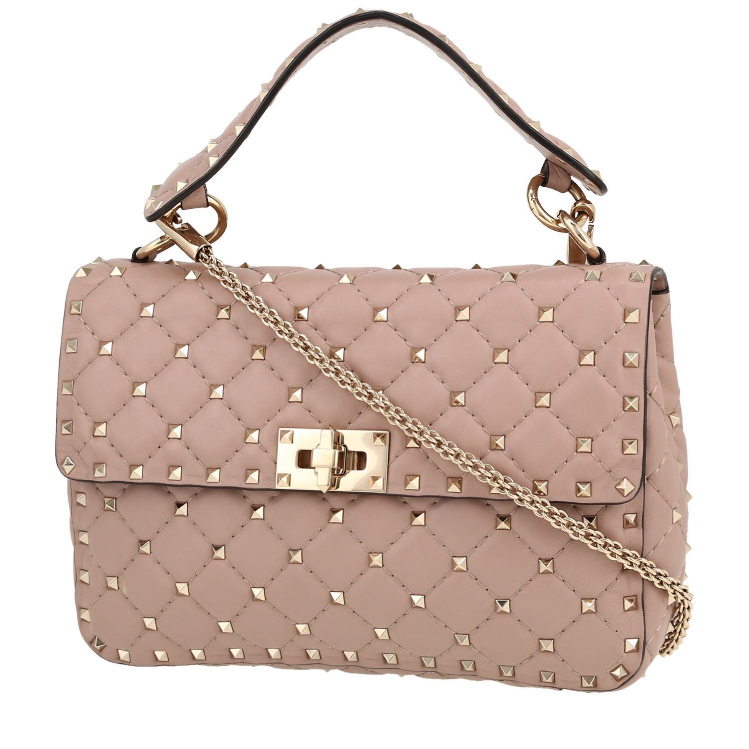 Magnífico bolso bandolera Valentino Garavani Rockstud Spike de cuero rosa de tachuelas, adorno en metal dorado, asa sencilla de cuero rosa adornado con tachuelas, una asa en cadena ajustable de metal dorado para llevar en la mano o colgado al hombro o cruzado.