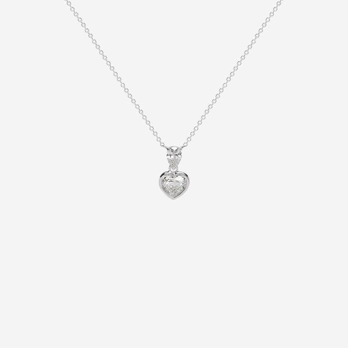 Collar de oro blanco y diamantes, en el cual figura de un delicado engaste de oro blanco delicadamente engastado de un diamante de talla corazón en total 0.45 quilate, realzado de un diamante de talla pera, sujetado por una delgada cadena de oro blanco.
