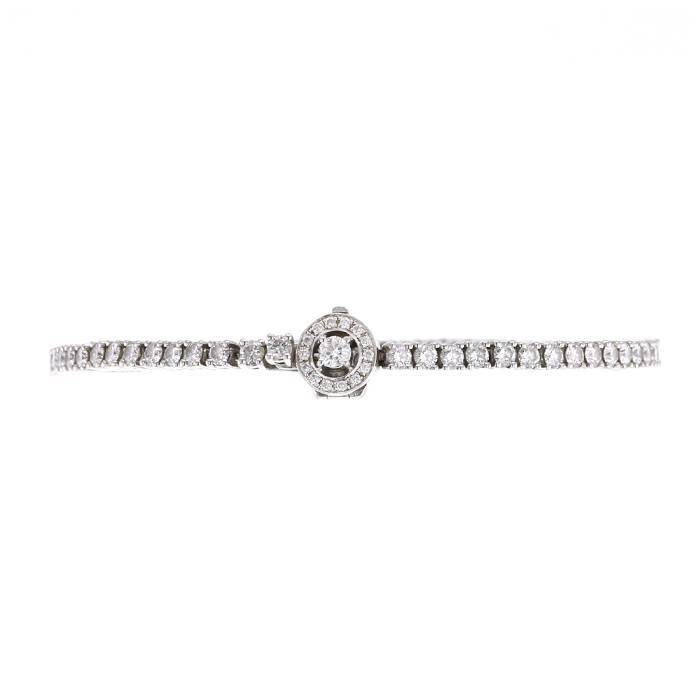 Brazalete Boucheron Ava de oro blanco y diamantes, compuesto de un delicado engaste articulado finamente engastado de 77 diamantes de talla brillante en total 3,17 quilates, que sujeta un bonito diseño redondo calado delicadamente engastado de diamantes, realzado en el centro de un bonito diamante de talla brillante de aproximadamente 0.05 quilate.