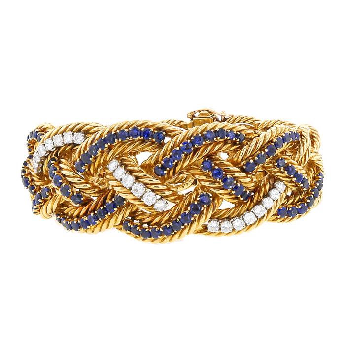 Magnífico brazalete época años 60 Boucheron de oro amarillo retorcido, de zafiros y de diamantes, compuesto de una magnífica trenza semiarticulada de oro amarillo, adornado en el centro de una muy bonita línea de diamantes ondulada de talla brillante pesando en total 1.90 quilate, realzado en los bordes de una sucesión de magníficos zafiros de talla redonda en total 4.20 quilates.