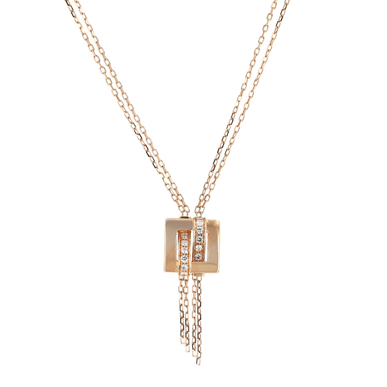 Collar Boucheron de oro rosa y diamantes, compuesto de un diseño cuadrado calado, adornado en el centro de tiras cruzadas elegantemente engastadas de aproxidamente 0,30 quilate de diamantes de talla brillante, sujetado por una cadena de eslabones encadenados doble de oro rosa.