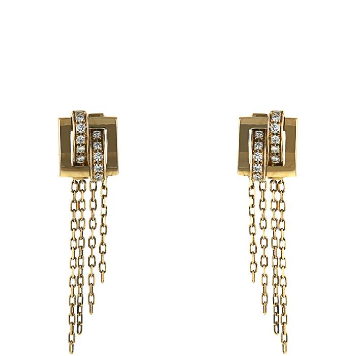 Magníficos pendientes Boucheron Déchainé de oro amarillo y diamantes, compuestos de un elegante diseño cuadrado calado, realzados de un precioso engaste cruzado delicadamente pavimentado de 12 diamantes de talla brillante.